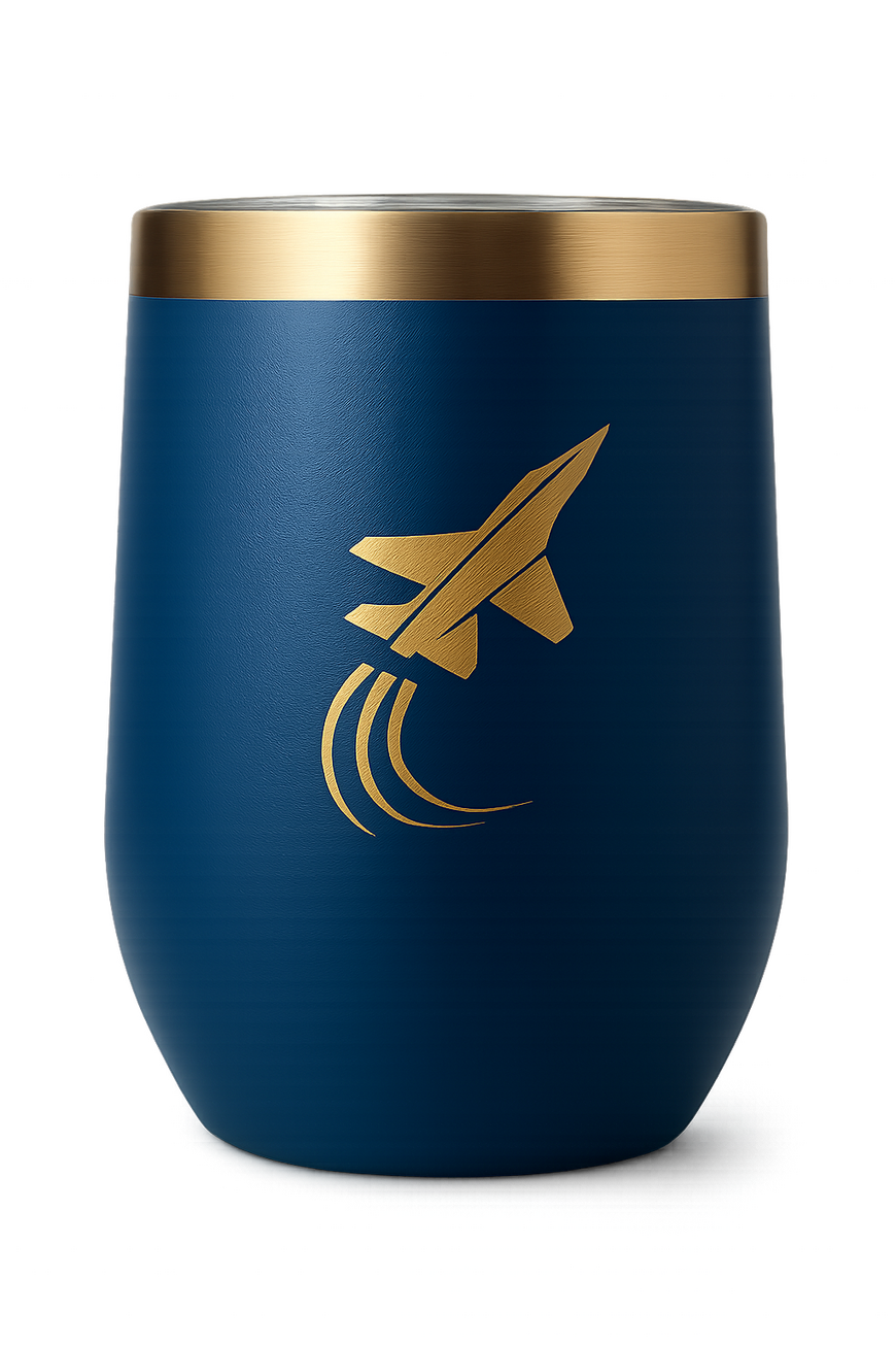 This luxury tumbler pairs rich deep-blue coating with a luminous brushed gold rim, echoing the serene, rising spirit of HAPPY. The engraved jet emblem adds a refined, timeless touch worthy of ARMYON AIRLINES.